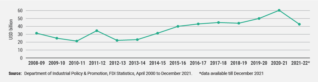 Foreign Direct Investment (FDI)7: India has emerged as a prime destination for Foreign Direct Investment (FDI) in recent years, driven by various factors that have significantly enhanced its appeal. The UNCTAD's World Investment Report 2023 ranks India as the eighth most preferred FDI destination globally. Moreover, India stands among the top three countries for greenfield investment announcements and ranks second in international project finance deals.