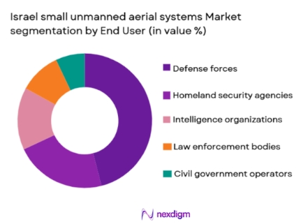 Israel small unmanned aerial systems market is segmented by end user into defense forces, homeland security agencies, intelligence organizations, law enforcement bodies, and civil government operators. Recently, defense forces have maintained a dominant market share due to continuous operational requirements, high deployment frequency, and prioritized budget allocation. Defense users demand multi-mission platforms capable of operating in contested environments, driving procurement of advanced systems with encrypted communications and electronic warfare resilience. Close collaboration between armed forces and domestic manufacturers accelerates customization and upgrades. Regular training, replacement cycles, and export-linked production runs further elevate procurement volumes within the defense segment.Â