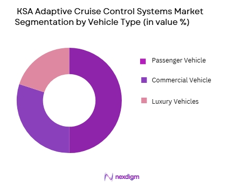 The KSA ACC market is segmented into passenger vehicles, commercial vehicles, and luxury vehicles. Passenger vehicles dominate the market due to the growing awareness of road safety and the increasing availability of ACC systems in mainstream models. Within the passenger vehicle segment, the rising popularity of SUVs and sedans equipped with advanced safety features is a key trend. The commercial vehicle segment, though smaller, is showing growth driven by fleet management requirements and regulatory mandates for safer road transportation. Luxury vehicles, while representing a smaller share, lead in ACC system adoption due to consumer demand for high-end features. Â