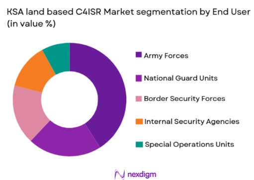 KSA land based C4ISR market is segmented by end user into army forces, national guard units, border security forces, internal security agencies, and special operations units. Recently, army forces have held a dominant market share due to their scale of operations, diversified mission requirements, and direct involvement in national defense modernization programs. Army units require comprehensive C4ISR coverage across maneuver, logistics, and command hierarchies, driving higher system volumes and complexity. Continuous training requirements, frequent system upgrades, and integration with allied forces further increase adoption. Strong institutional funding, centralized procurement authority, and priority access to advanced technologies ensure sustained demand from army forces relative to other security entities.Â