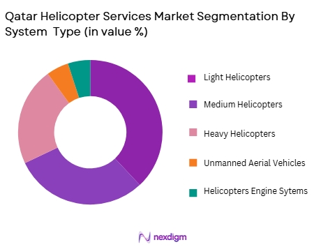 The Qatar Helicopter Services market is segmented by system type into light helicopters, medium helicopters, heavy helicopters, unmanned aerial vehicles (UAVs), and helicopter engine systems. The medium helicopter segment is particularly dominant, owing to its versatility and wide usage across multiple industries such as offshore oil exploration, military, and emergency medical services. These helicopters offer a balance between capacity, range, and cost, making them ideal for operations in the region’s challenging environments.Â