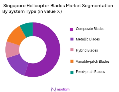 The Singapore helicopter blades market is segmented by system type into composite blades, metallic blades, hybrid blades, variable-pitch blades, and fixed-pitch blades. Among these, composite blades have the largest market share, due to their lightweight nature, improved fuel efficiency, and resistance to corrosion. Composite blades are increasingly favored in both military and civilian applications, as they reduce operating costs and increase the overall lifespan of the helicopter. Their advanced material composition, including carbon fiber and fiberglass, also allows for better performance under extreme conditions, which is essential for both military missions and emergency services.